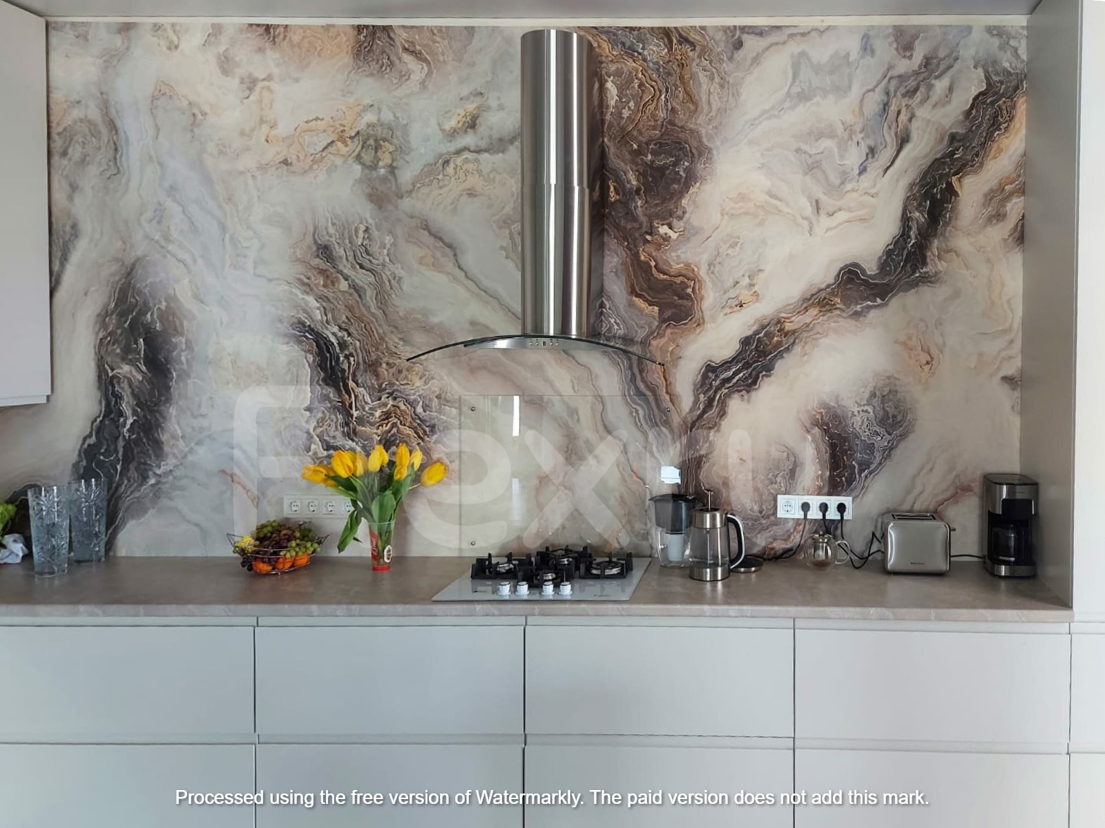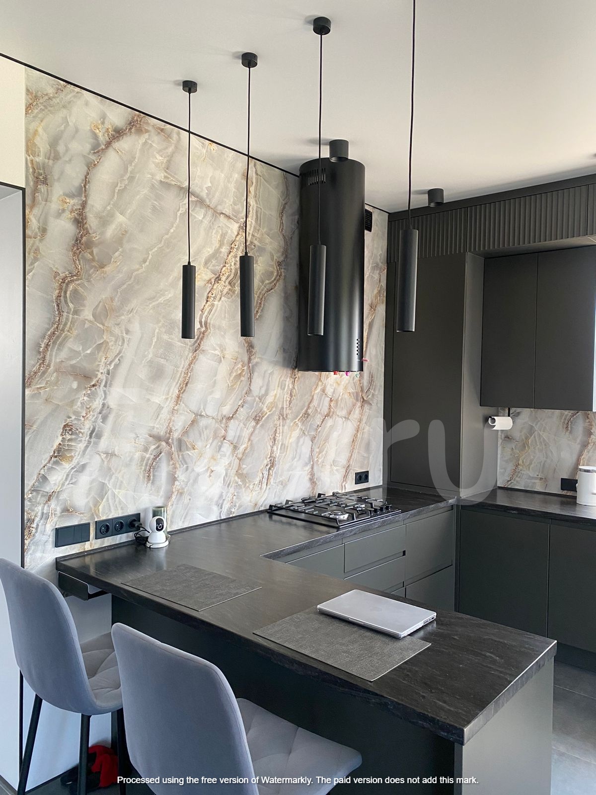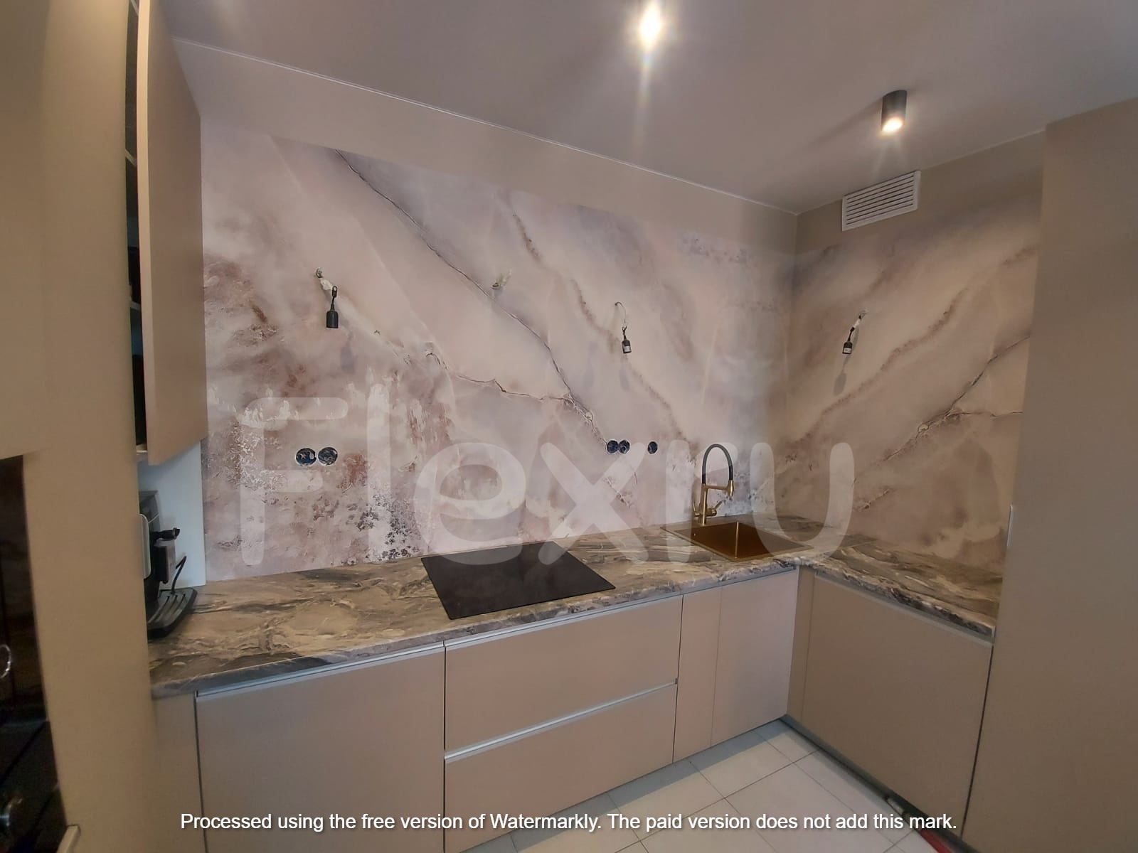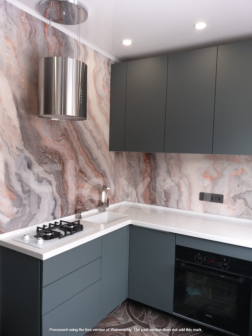 Благодаря составу (акрил, каменная крошка + финишное покрытие) гибкий мрамор применяется на кухне: