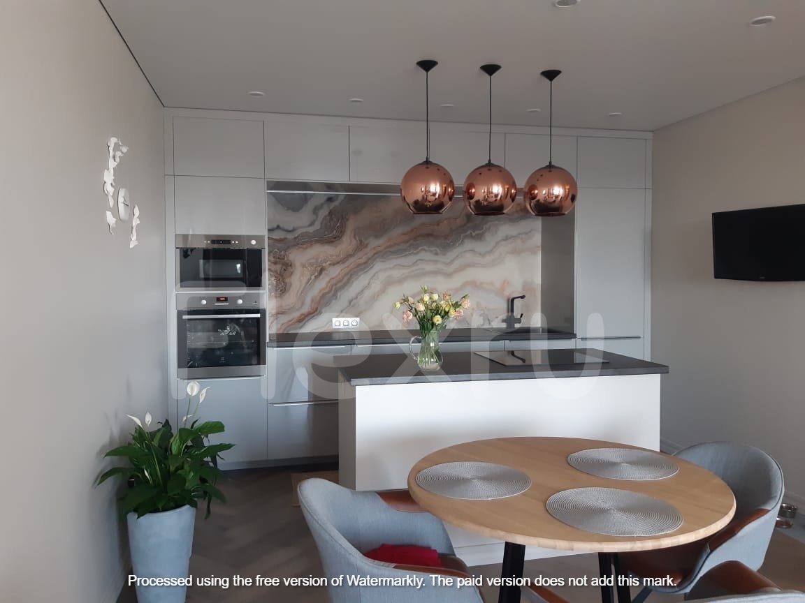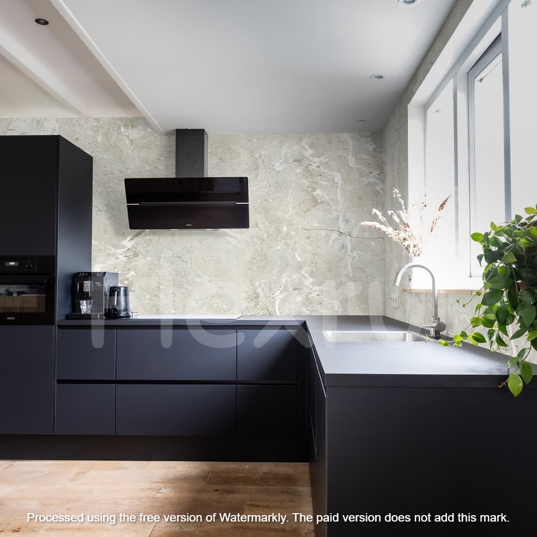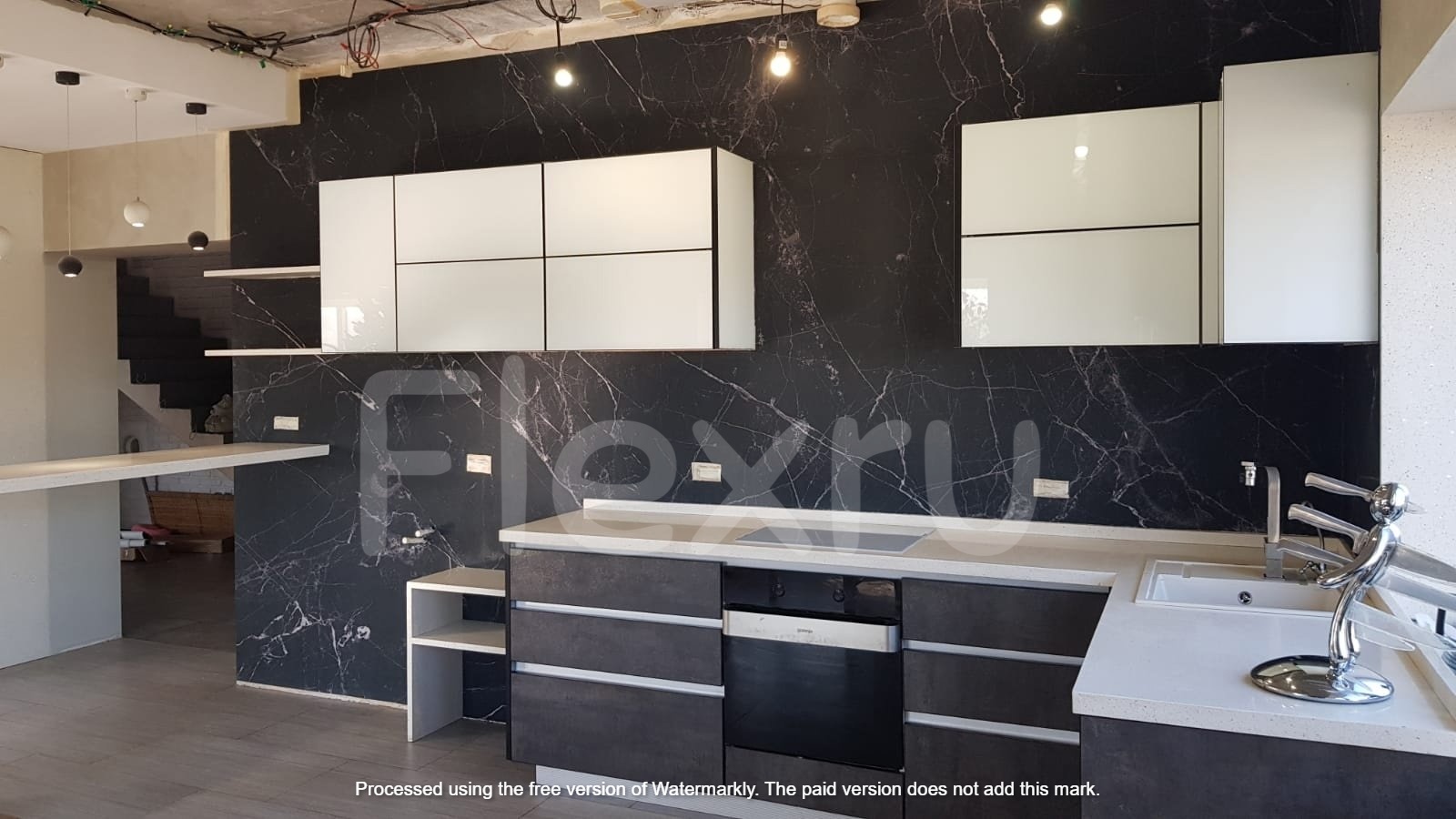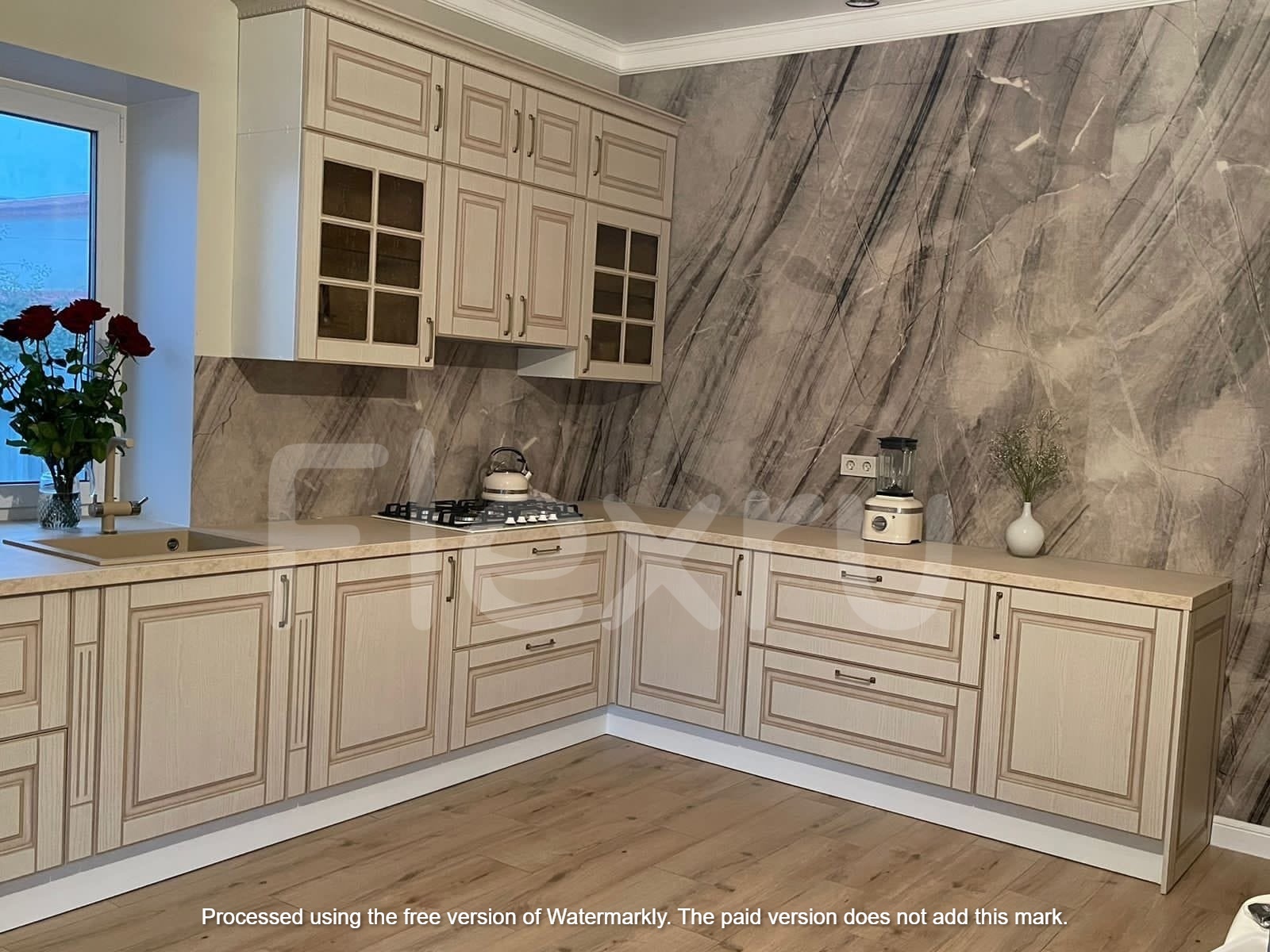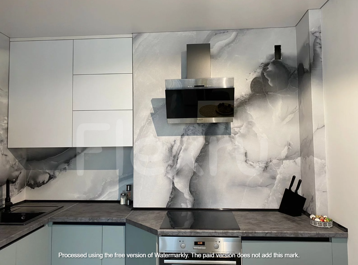 Благодаря составу (акрил, каменная крошка + финишное покрытие) гибкий мрамор применяется на кухне: